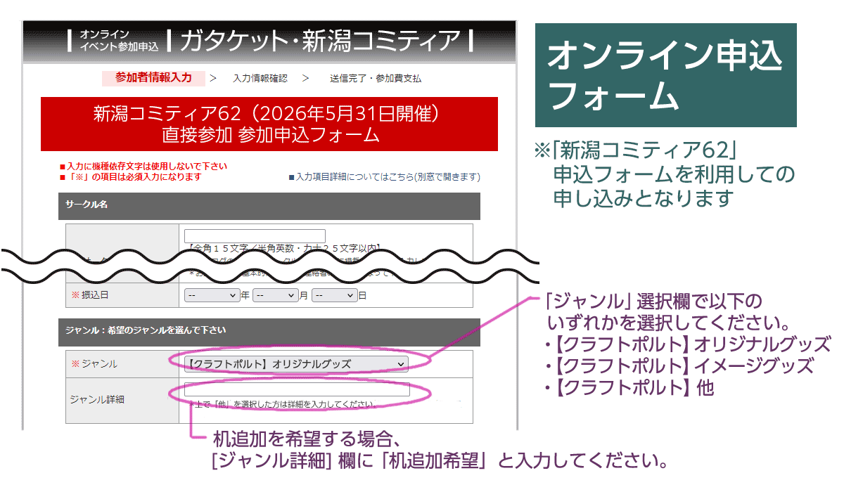 「新潟コミティア62」申込フォームを利用しての申し込みとなります。